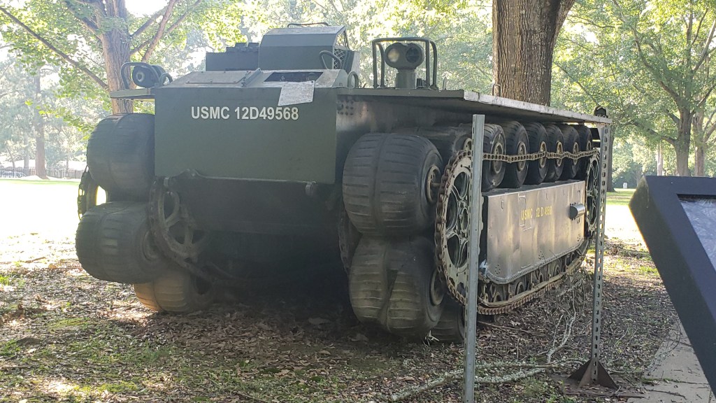 It has been several years since the team has had a tank drive drivetrain and unfortunately we chose to disassemble it in order to reuse the parts. So as one of our summer projects, we have been hard at work on developing our own tank drive system. It’s quite a bit more complicated than just bolting on a couple of motors and wheels. While the internet has pages and pages of information on this kind of drivetrain, it can be difficult to really wrap your mind around what is being described in diagrams and photos. So we took advantage of some of the resources available to us at ERDC and took a close look at some of the static displays on the grounds.