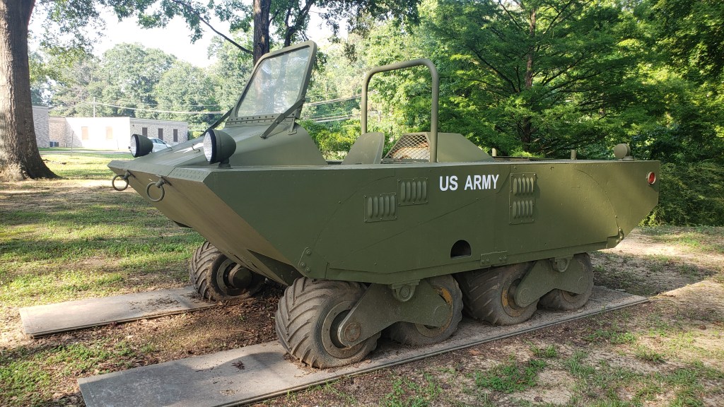 The Airoll (XM769) Amphibious Logistical Carrier not only has a very long name, but it also features a unique combination of pneumatic tires and a rigid track. It was successful both in water and on land during testing as a result of this combination. Despite its heavy weight of 12,400 pounds, it is able to keep ground contact pressure to only 1.5 PSI as the weight is distributed over the tires.