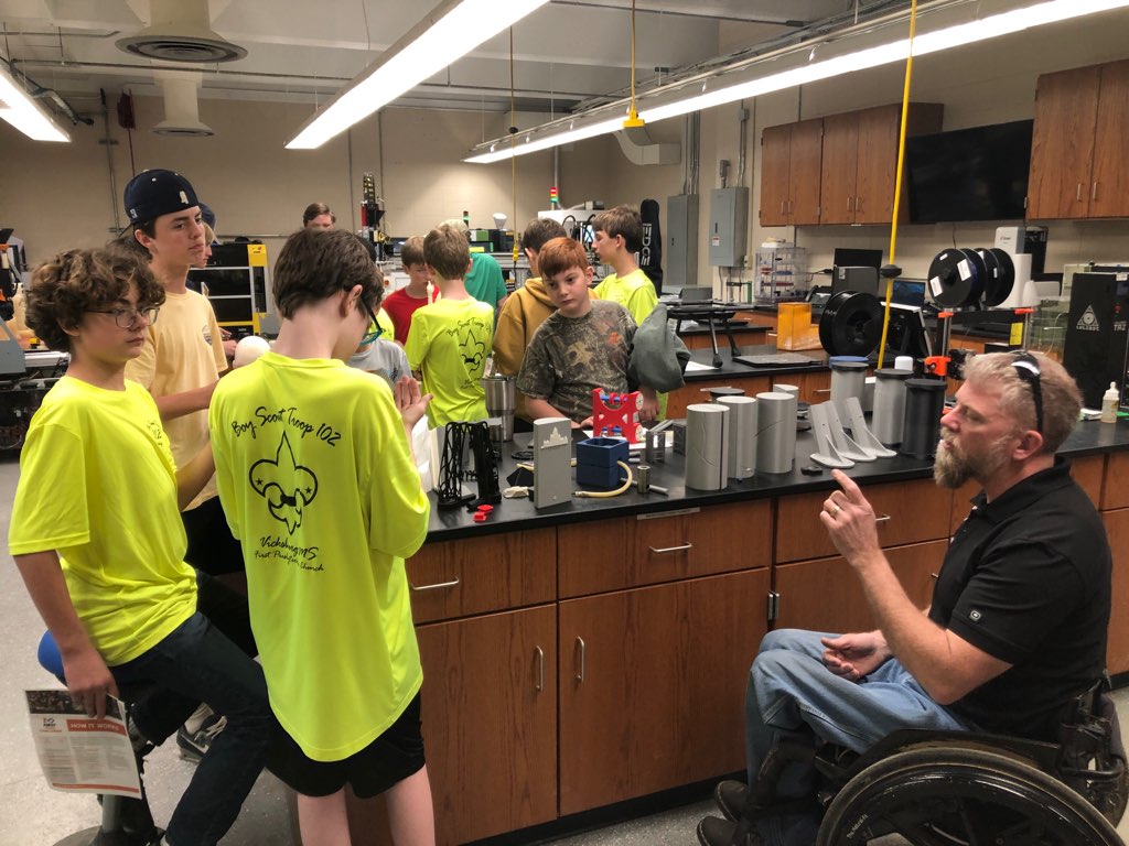 On Saturday, April 2, 2022, Trial and Error Robotics was given the opportunity to participate in an annual Scouts BSA camp-out hosted by the Engineering Research and Development Center (ERDC). This event gave the opportunity for scouts in troops 7, 8, 88, and 102 from the Andrew Jackson Council of the Boy Scouts of America to learn about Science, Technology, Engineering, and Mathematics. Lasting from April 1 to April 3, the camp showcased labs on the ERDC campus. Among the labs showcased was the Geo-technical and Structures Lab (GSL). Our team mentors who work in the Concrete and Materials Branch of GSL, Cody Goss and Hayden Hanna, spoke with the scouts about how the skills learned in FIRST robotics can be useful in a future STEM career.