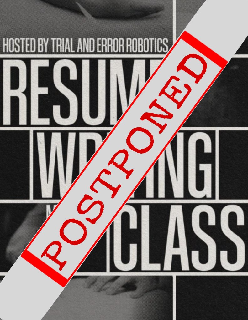 As some of you already know, our resume writing class that was scheduled for May 14th has been postponed until further notice, registration through the google form, however, is still open. Thanks to everybody who signed up! We will notify those who signed up and any new participants when a new date is selected.