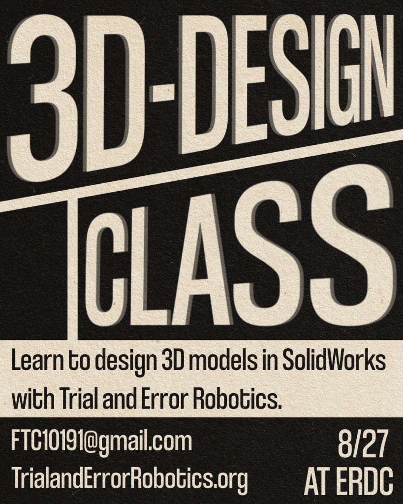SolidWorks is a CAD (computer aided drafting) program used by professionals across STEM fields to create schematics and 3D models of their parts and assemblies prior to manufacturing. Trial and Error Robotics will be hosting an introductory class to SolidWorks for teams and individuals to bring their designs to the next level. The class, which will be taught by our coach Mr. Cody, a SolidWorks professional himself, will be hosted at Vicksburg’s Engineer Research Development Center from 10 AM to 4:30 PM.