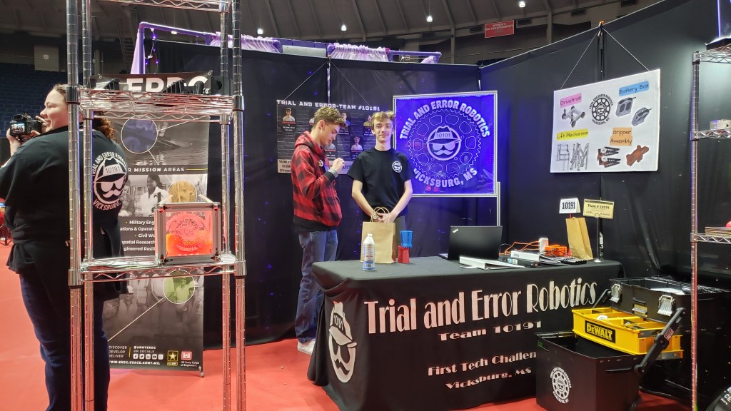 The competition began early the next day at the University of Mississippi’s Tad Smith Coliseum where each team in the coliseum had set up a personalized booth that highlighted their team, robots, and design. Our booth acted not only as an informational hub for judges and other teams to learn about our outreach and operations out of Vicksburg’s Engineer Research Development Center (ERDC), but also as a miniature workshop for our pit-crew to make adjustments in between rounds. We participated in a total of 6 qualifying matches, winning 4 and losing 2, and were ranked 5th overall by the end of the day’s normal rounds.