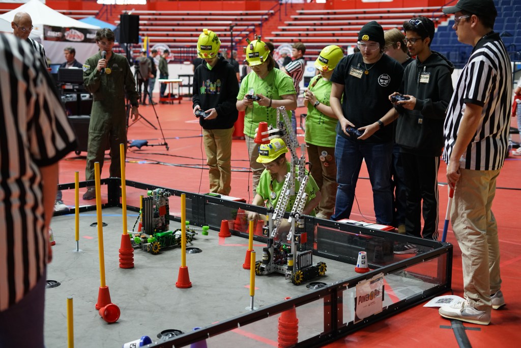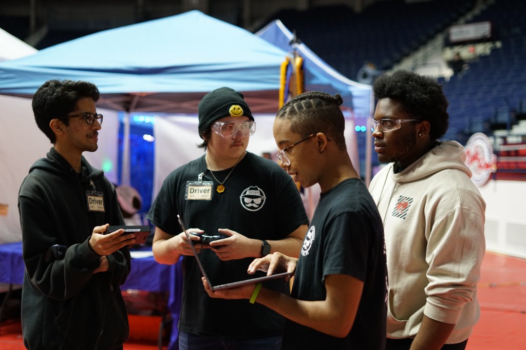 After arriving on Friday afternoon, our team was quickly queued for our judge’s panel. FIRST competitions employ a panel of adult volunteer judges that ask questions about the team’s decision making and season strategy to team members in consideration of awards. These awards recognize the whole of a team’s operations, considering not only the robot’s design and functionality, but also categories such as teamwork and outreach. Our team members left the panel feeling confident in our performance, and we quickly moved onto robot inspection.