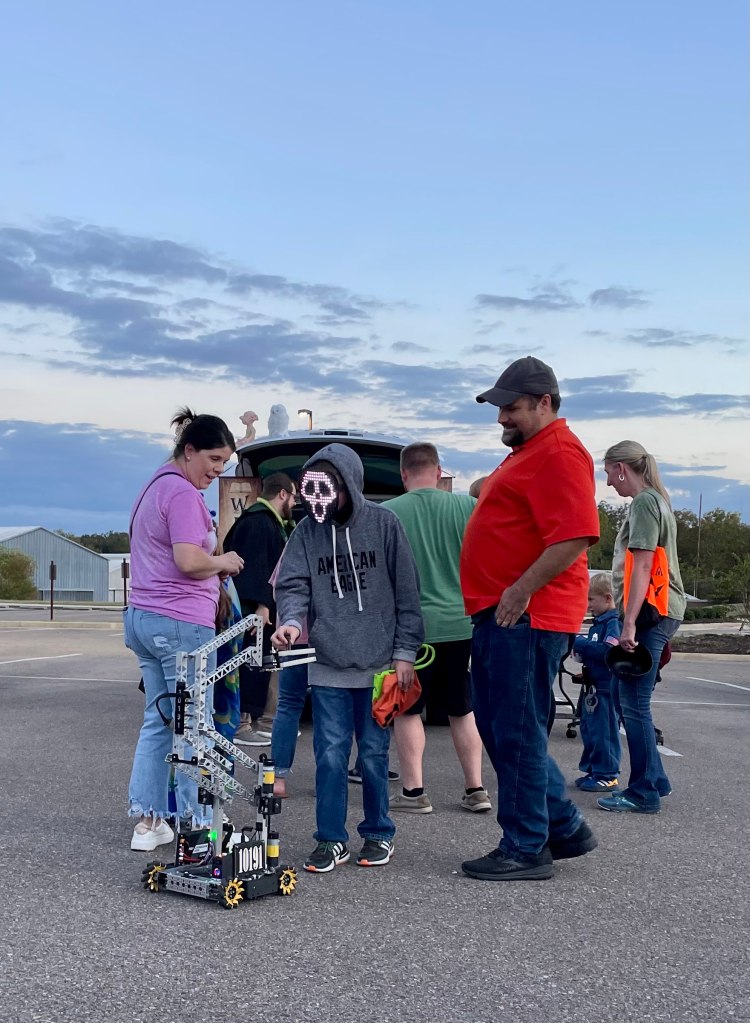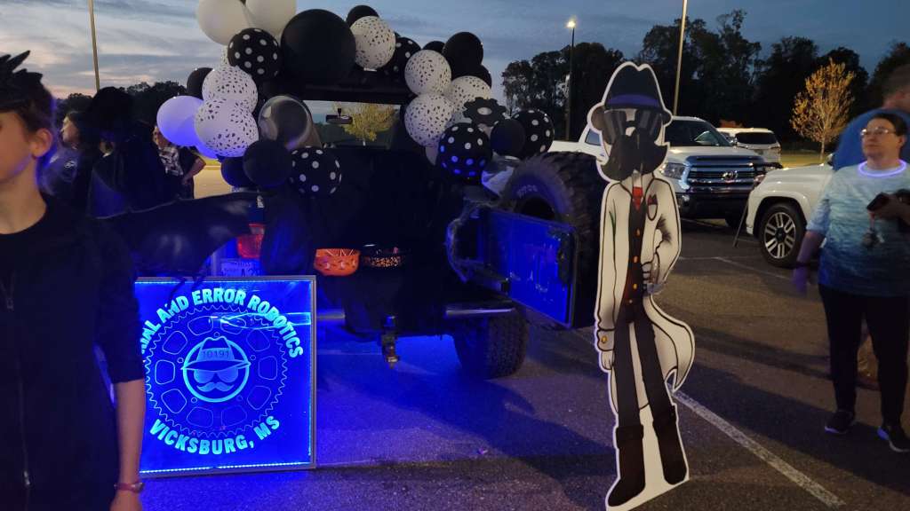 We decorated one of our mentor’s blue Jeep with a simple black and white theme to match our team colors, and balloons and gears tied around its roll bar. Our mascot was also present, propped against the tailgate next to our LED logo sign. Almost the entire team was able to come out and volunteer to pass out candy, and most of us dressed up in Halloween costumes too.