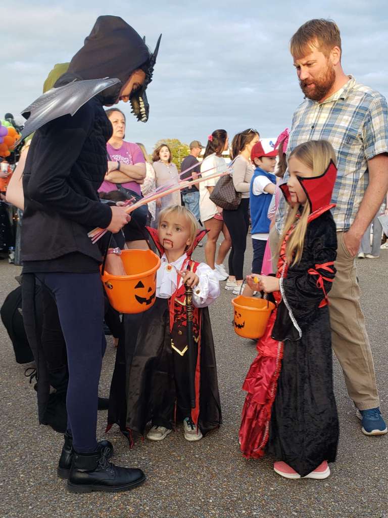 Lots of trick-or-treaters came to the Trunk-or-Treat event dressed in some fantastic costumes. There were a few inflatable dinosaur costumes, lots of vampires, a dragon or two, and a cute little duckling, to name a few. The kids were really excited about the event.