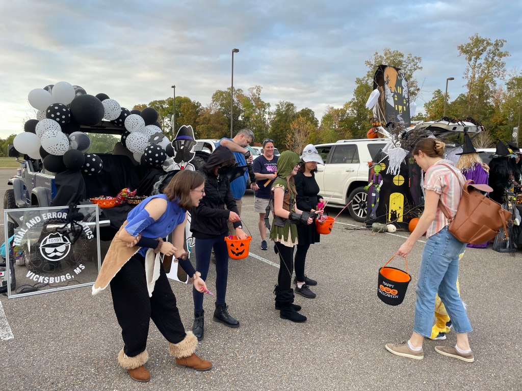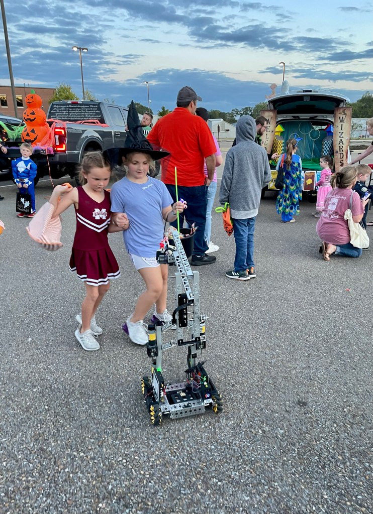 Trial and Error Robotics got to go totally batty this year at the U.S. Army Engineer Research and Development Center’s Annual Trunk-or-Treat. This year, the event was held at the Headquarters parking lot, and our team had the privilege of helping to pass out candy to visiting trick-or-treaters. There were lots of volunteers there passing out candy alongside us. The vehicles were each decorated with different and unique themes. Some vehicles really caught your eye; one had a giant purple dragon inflatable, and another one was decorated like a quidditch field from Harry Potter.