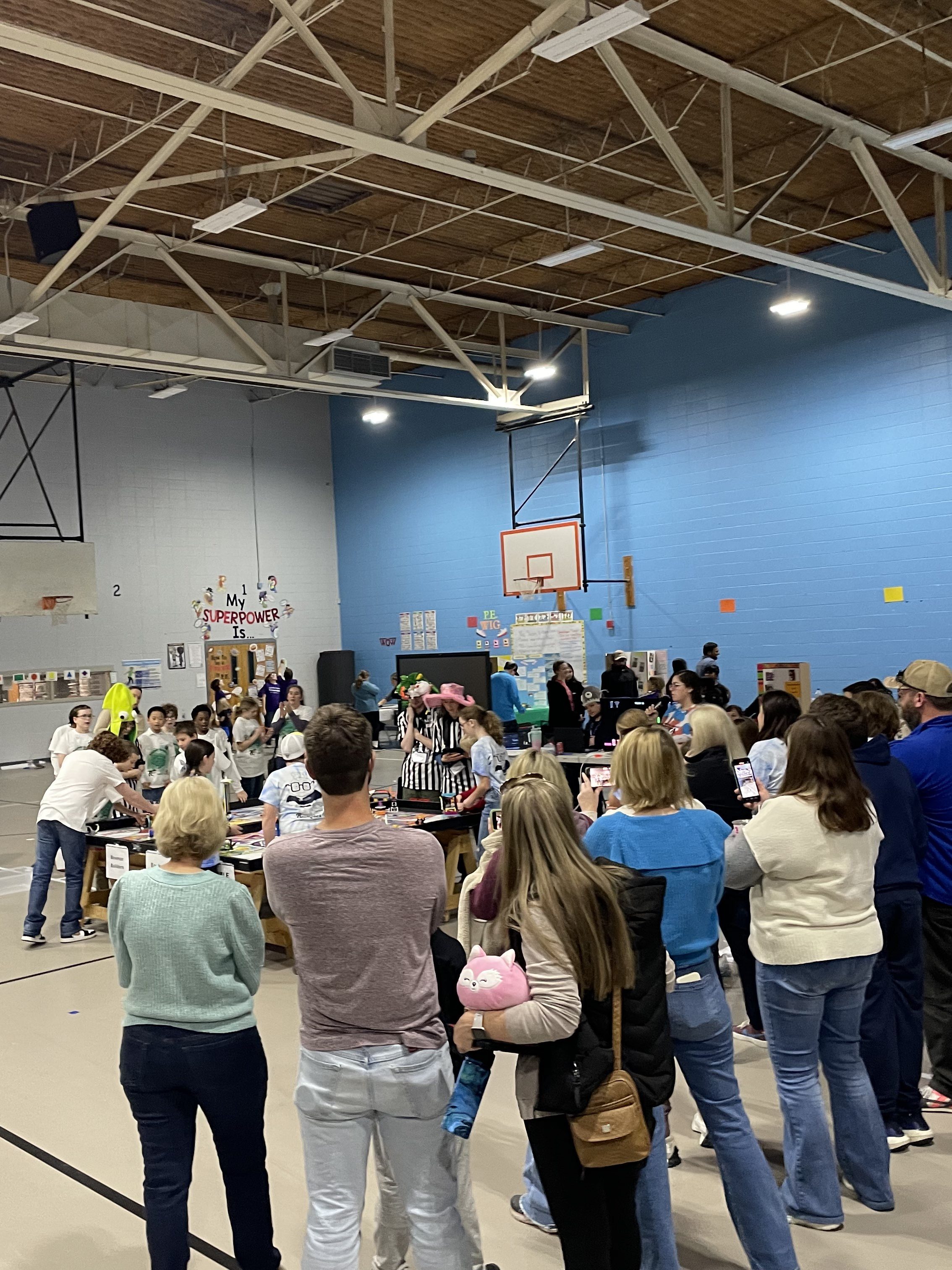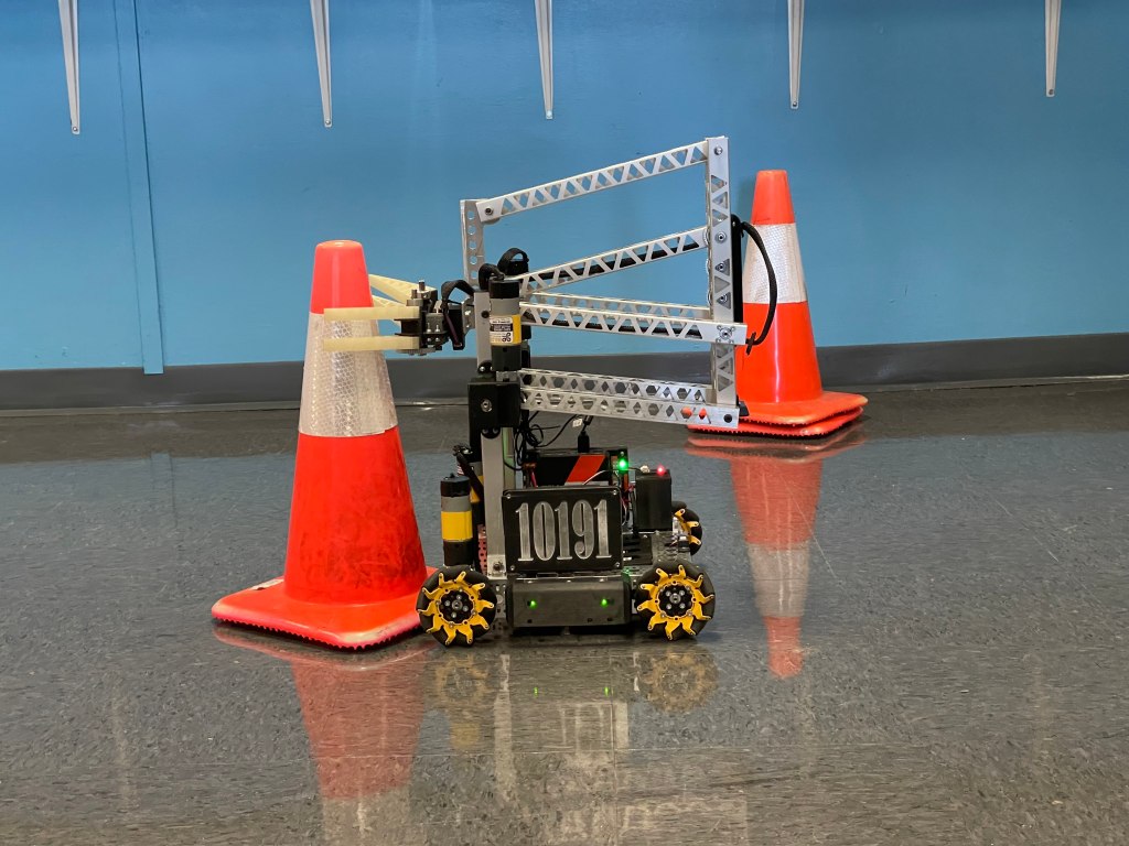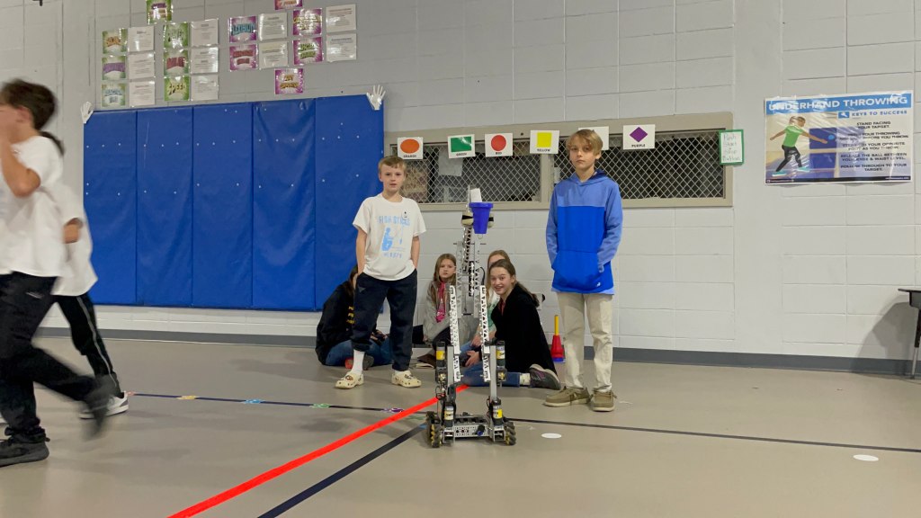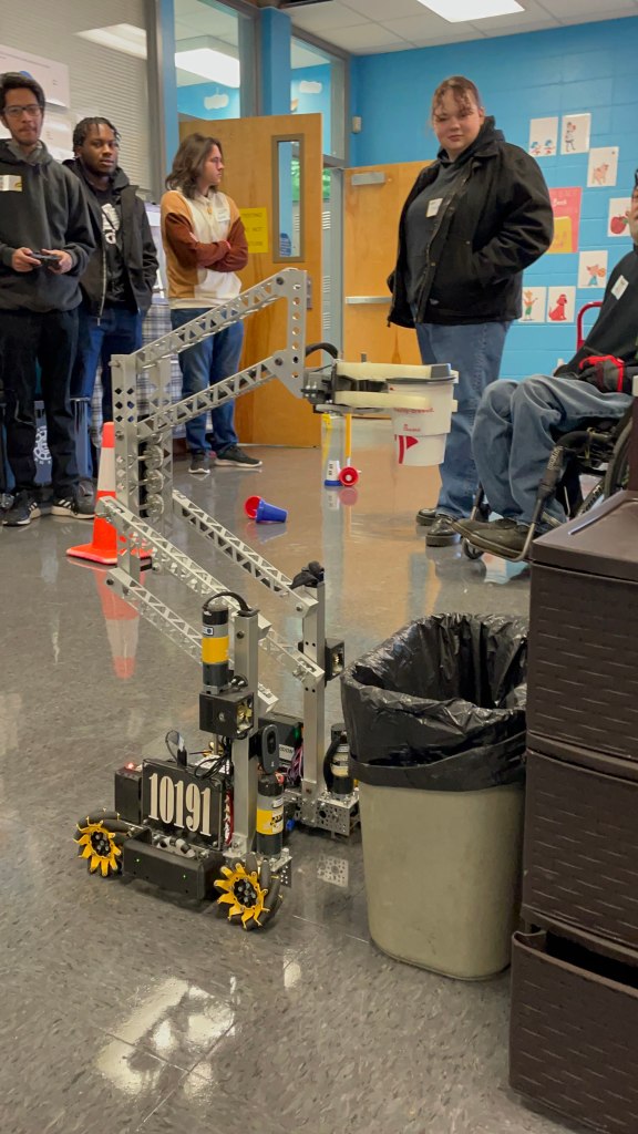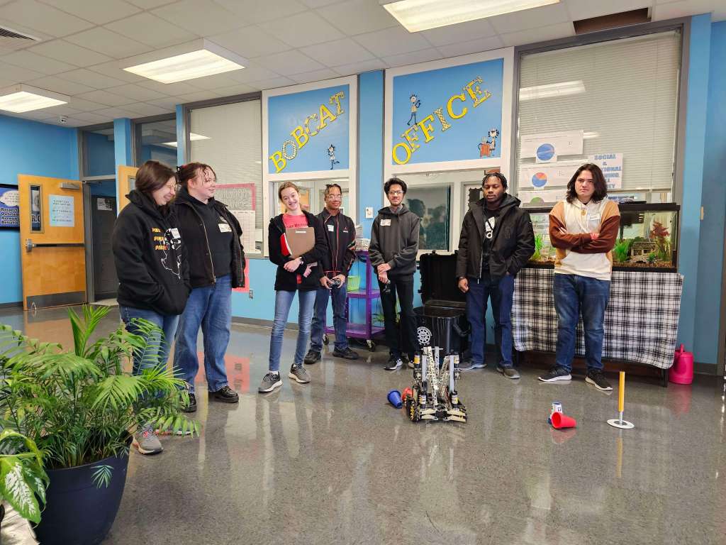 The event coordinator, Mrs. Kristy Brannon, reached out to our team, asking us if we would showcase our skills by bringing one of our bots to the competition. So we brought Bessie, last year’s competition robot, for our demonstration. We set up in the lobby for our demonstration. We caught many people’s attention by having Bessie pick up cones and bottles, stack them, and bring them to people. The kids were curious about our Bessie as it rolled into the gym. They were excited to see a bot made of metal instead of Legos.