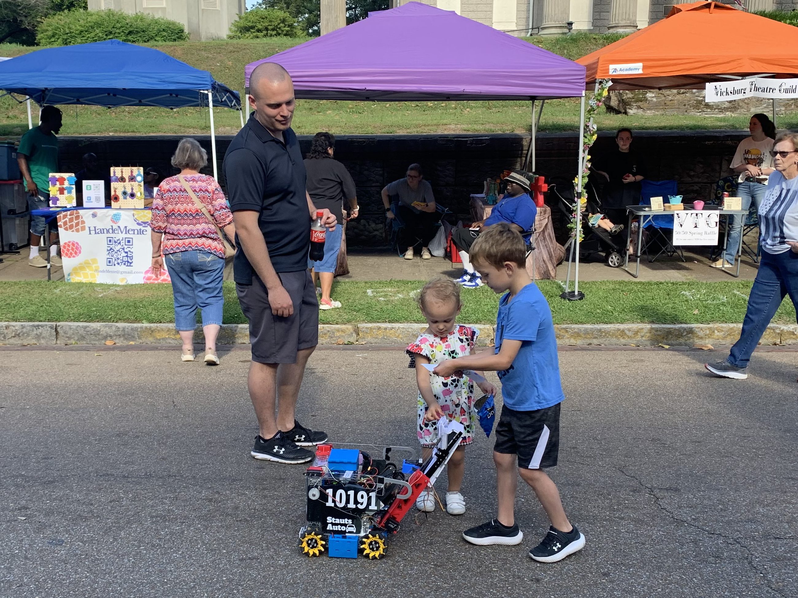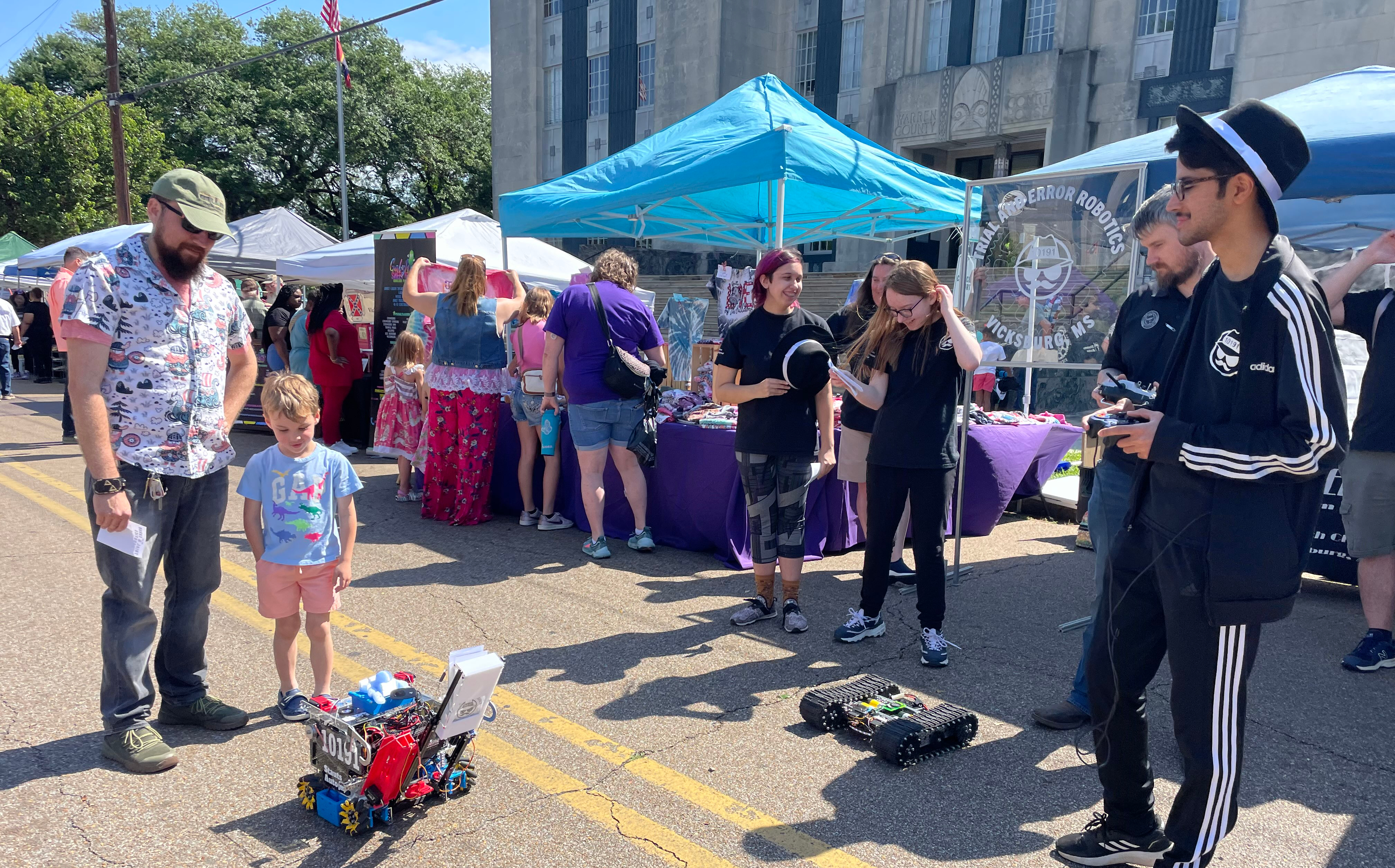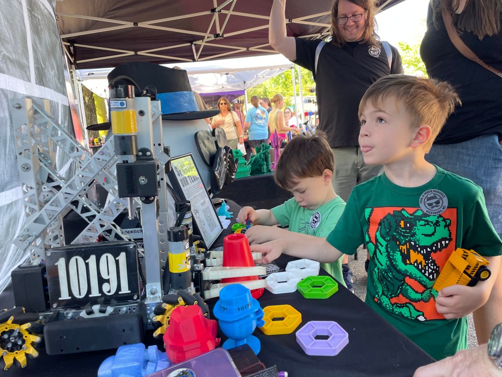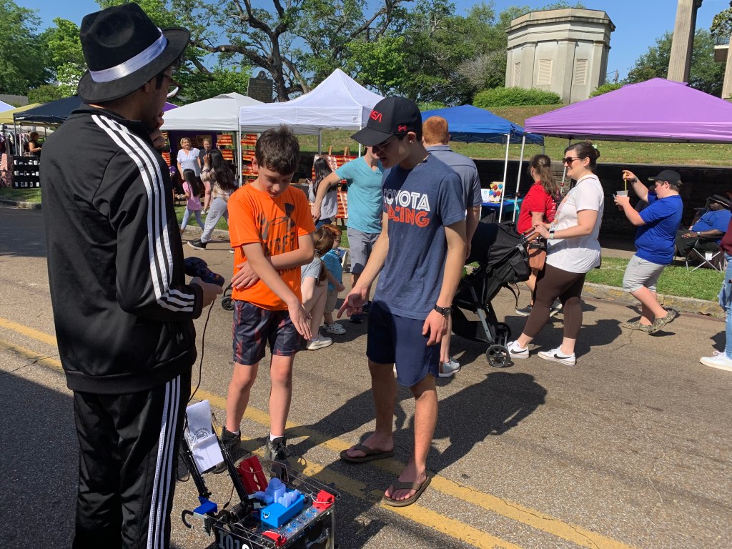 It was a breezy and sunny day, perfect for shopping at the Old Courthouse Spring Flea Market! People walked up and down the street, looking at the many colorful vendors. Each booth caught the eye with their beautiful and unique displays. Our booth was no exception, with awesome robots and lots of enthusiasm.