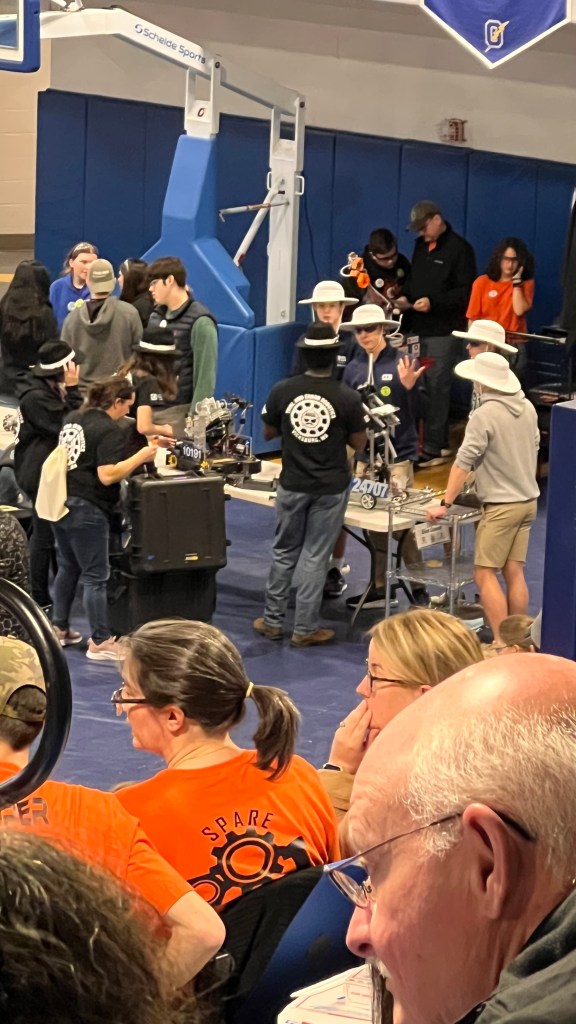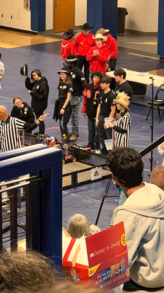 Readers, we regret to report that our first match was rough. Our excitement had turned into a panic when we noticed our autonomous was having some troubles. Our poor drivers struggled trying to push or move due to technical difficulties in the programming, but we got that fixed straight away. Then our claw which had worked without fail began to show signs of failing. The mechanism had some difficulties being too loose and having a hard time picking up the samples without dropping them. We struggled but we remained optimistic. When some of our team alumni heard what had happened, they came just in time for the chaos to cheer us on, with extra support and the team continued to push forward and powered through it all.