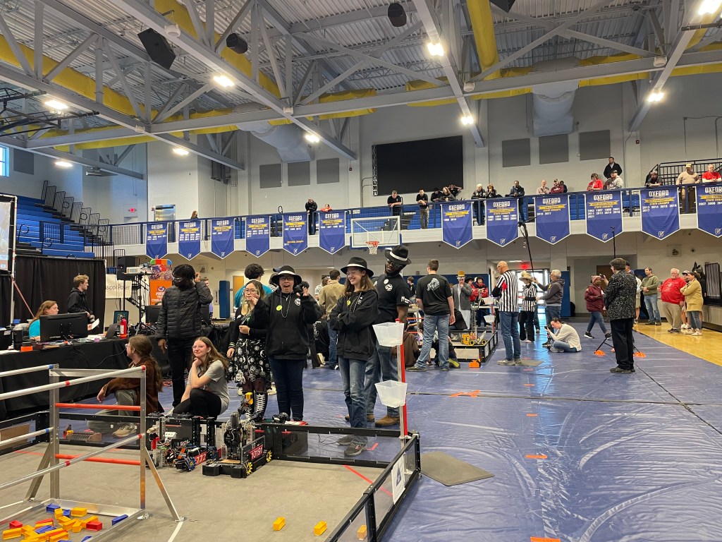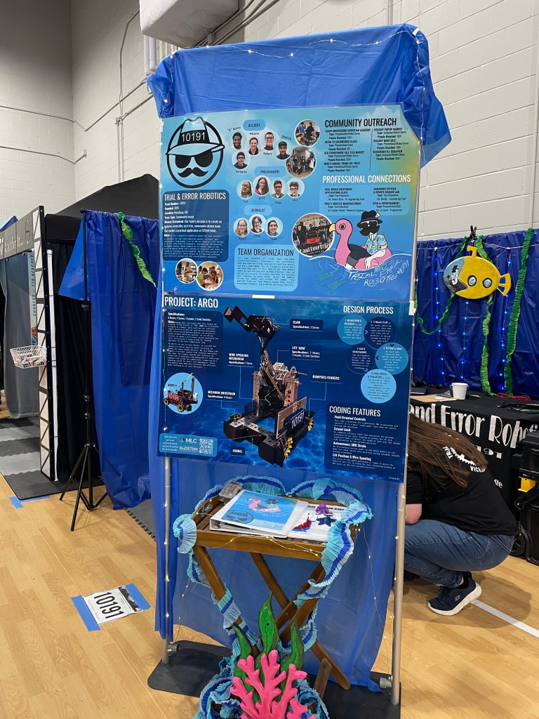 The next morning, we met at Oxford High School to set up our “Dive into the Deep” team booth decorated with our posters of our team and ARGO, 3-D prints of sea creatures, and glowing lights. There was even General Mayhem himself driving a submersible made out of foam. Some of our teammates decided to head to the competition together and chat with the other teams so we would know who would we work best with, and what their strategies were if they were our alliance or our competitor in the next challenge ahead.