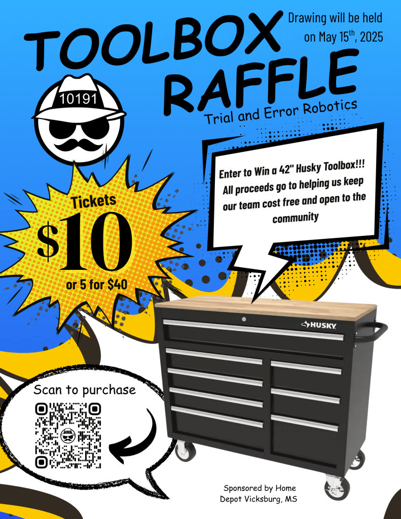 It is I, General Mayhem of Trial & Error Robotics, emerging from a cloud of solder smoke and sawdust to deliver a most thrilling announcement: We are holding a raffle! And not just any raffle—oh no! This one features a magnificent, 42-inch Husky toolbox, generously donated by our local Home Depot (the noble keepers of all things bolt and beam).