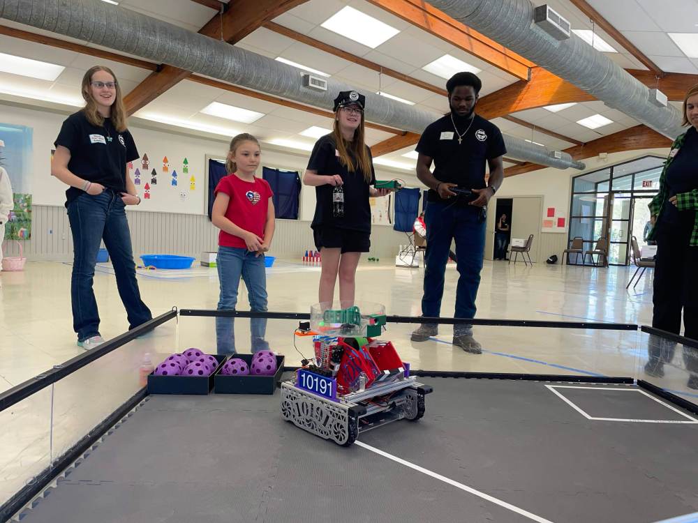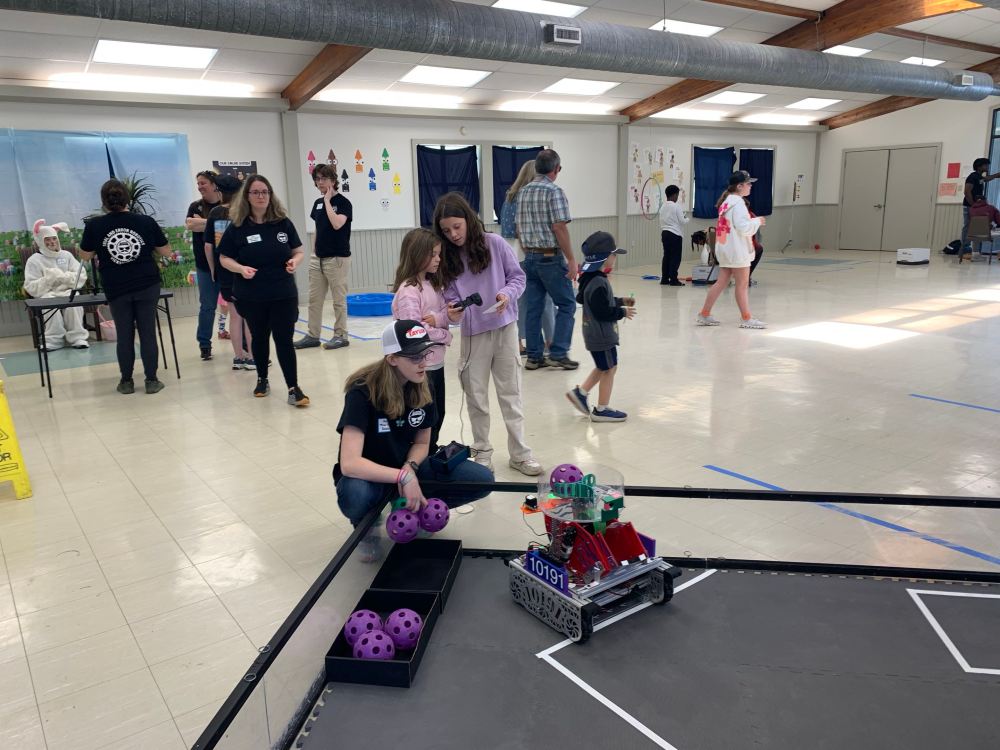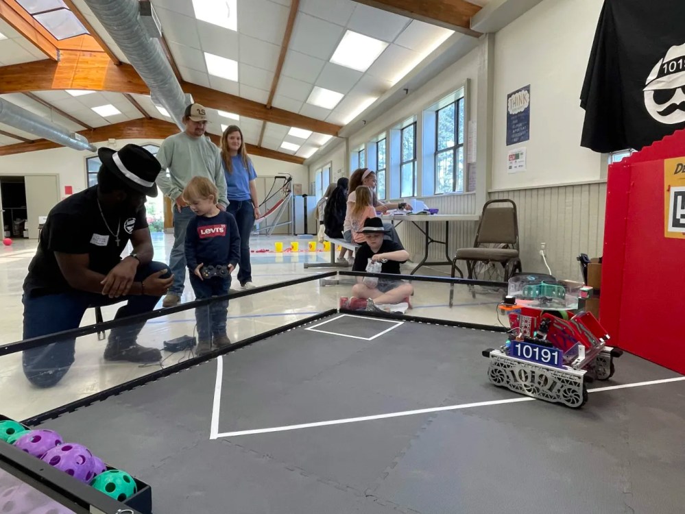 The team made the excellent decision to bring our bot, Nautilus, from this year’s competition. We set up a mini competition field for the kids to try their hand at driving and launching artifacts into the goal. The kids had a lot of fun driving and careening the bot into the field walls and trying to shoot artifacts into the goal. The team also gave out stickers and some 3D prints to reward their efforts.